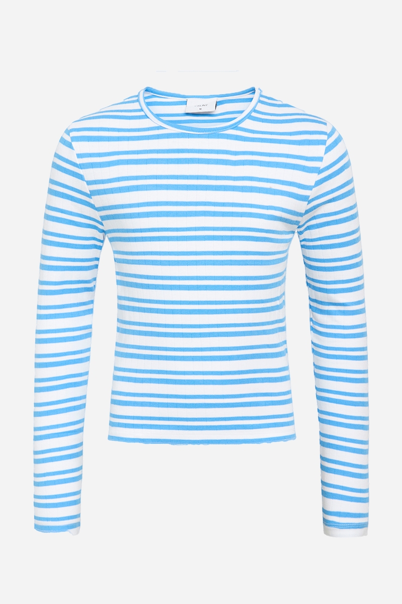 Riktigt snygg långärmad t-shirt från Grunt . Skjortan kommer här med ränder i färgerna vit och ljusblå. Skjortan är gjord i ribbad kvalitet och är töjbar.