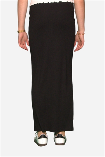 Riktigt snygg ribbad kjol från Grunt . Kjolen kommer här i en klassisk svart med slits på ena sidan. Kjolen är väldigt stretchig och lång i modellen.