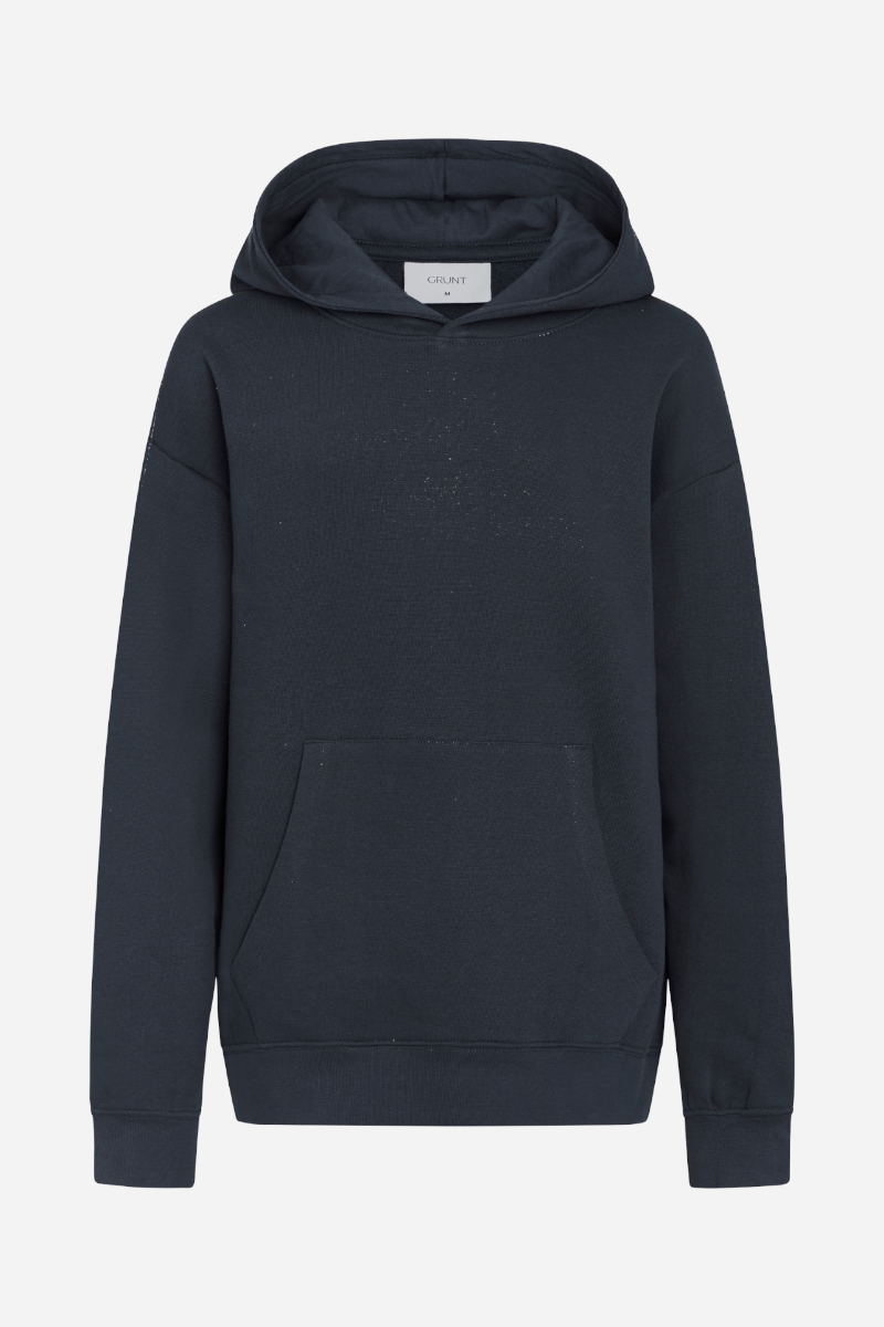 Snygg hoodie från Grunt . Huvtröjan kommer här i en snygg mörkblå. Framtill har hoodien en känguruficka. På baksidan finns ett stort djärvt tryck. Tröjan är gjord i en skön bomullskvalitet.