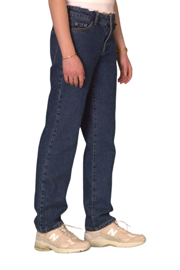 Supercoola jeans från Grunt . Jeansen är gjorda i en snygg mörkblå denimfärg. Jeansen är vanliga i midjan, varken låga eller höga. De stängs med knapp och dragkedja, och det finns invändiga justerbara resårer som kan justeras efter behov. Jeansen går rakt upp och ner för benen.
