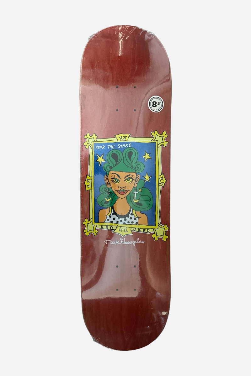 Skivan är gjord av 7-lagers lönnträ. Denna bräda kommer i en bredd som kallas 8,5". På baksidan finns en cool design.