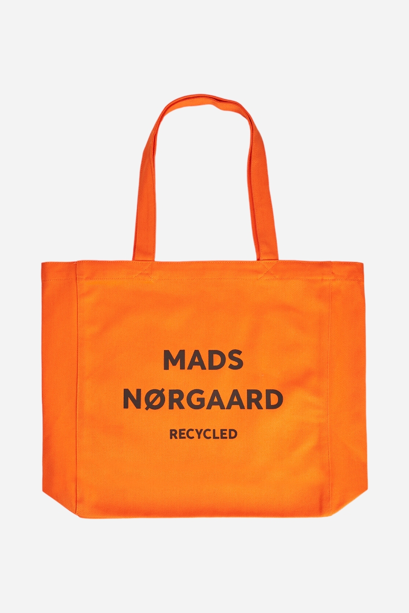 Snyggt nät från Mads Nørgaard i orange. Nätet har en stor logga på framsidan med svart skrift. Nätet är tillverkat av en stark återvunnen bomullskvalitet. Det är perfekt för shopping!