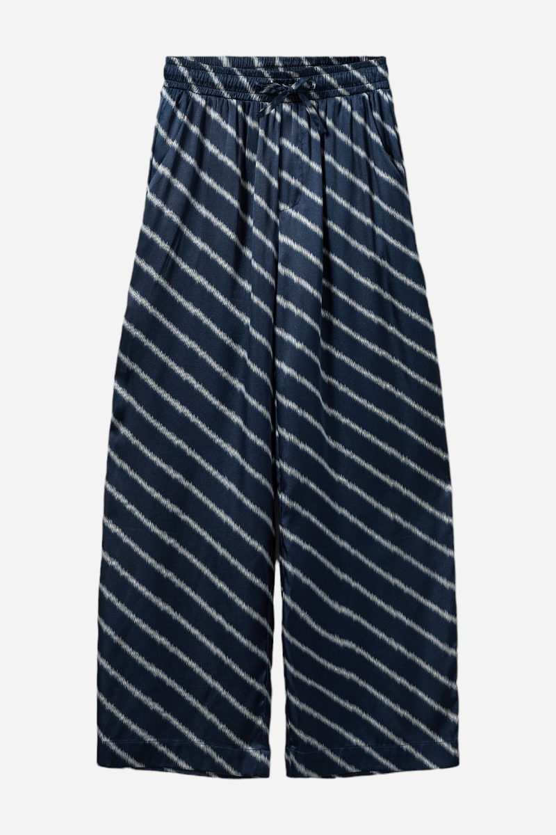 Fina byxor från Sofie Schnoor . Byxorna kommer här i mörkblått med ljusa diagonala ränder. Byxorna har lös passform. I midjan finns en resårkant med knytband.