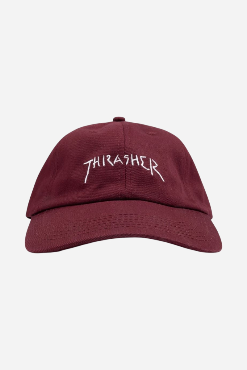 Fin keps från Thrasher . Kepsen kommer i en läcker vinröd med Thrasher -logotypen broderad i vitt.